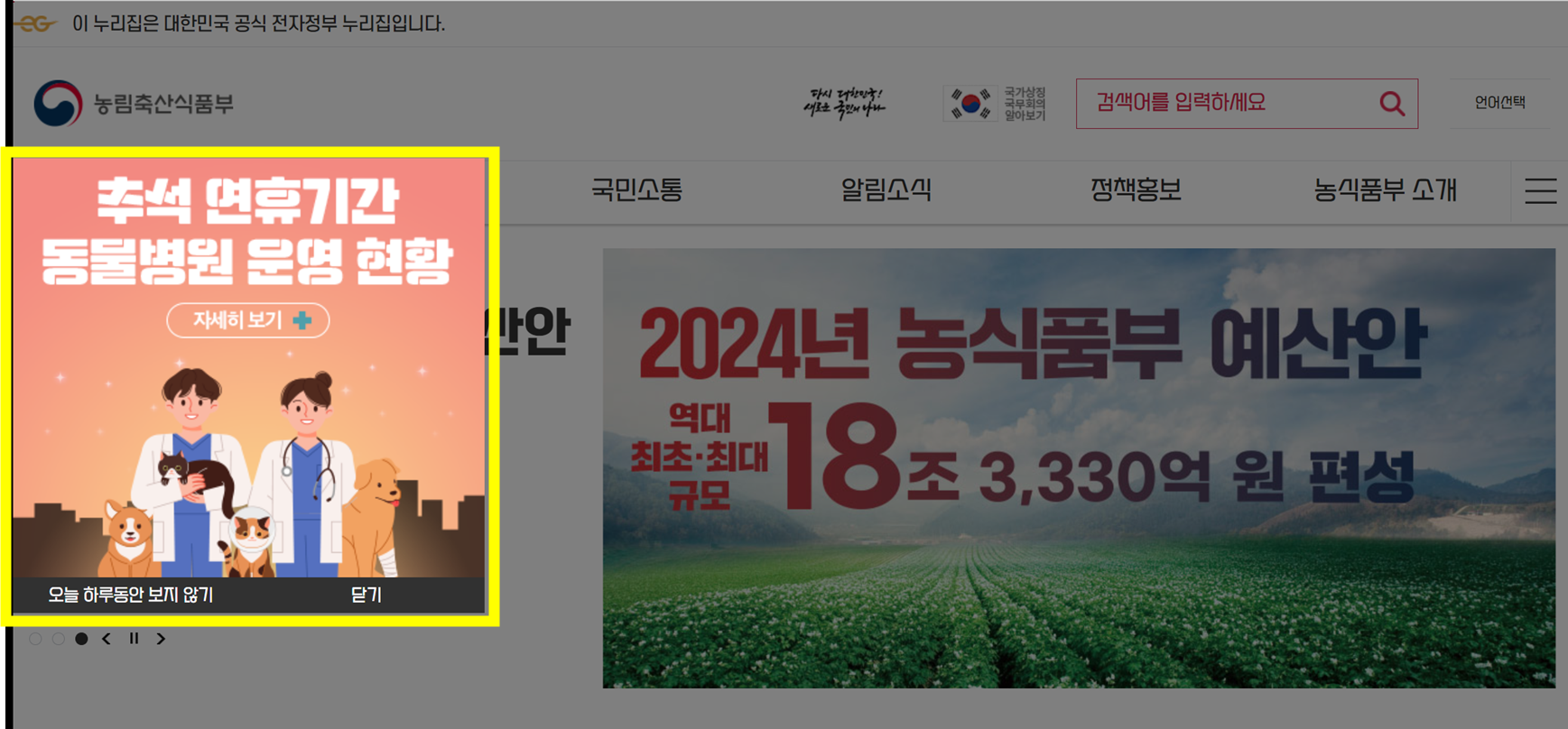각 사이트에 접속하시면 아래 노란색 테두리 창과 같이 메인 화면에서 "우리동네 응급 동물병원" 혹은 "응급동물병원" 팝업 창을 확인 하실 수 있습니다.